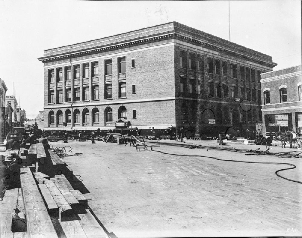View north on Van Ness toward Grove, Commerce High School (Newton J. Tharp Commercial School) being moved. The building was just completed at Grove and Polk when plans for the the new Civic Center were finalized. Rather than demolishing it, it was moved from the site to the northeast corner of Fell and Franklin, where it still stands in 2021.OpenSFHistory