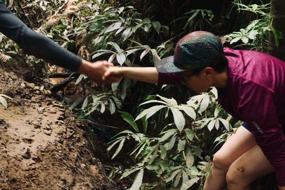 Paul caught up to us just as we were looking for where the track resumed, the water having become too deep to continue wading. Together we took a look at the map, backtracked just a little, and clambered up the bank back onto the track. Half an hour later I found myself wedged in a creek – bracing my legs against its far side to avoid dropping into the water below – having lost my footing on a deceptively slick and steep patch of clay. I felt vindicated in my folly when Paul, inching down the slope towards me, fell and ended up wedged right along side me. Tossing his pack and poles safely ahead of him, and with a foothold from me, he was able to clamber out the far side just in time for Rose – who was manoeuvring to take a photo of my predicament – to also lose her footing and come crashing into me. In the end, after we dislodged Rose, I opted to render my own rescue and levered myself out of the crevice.